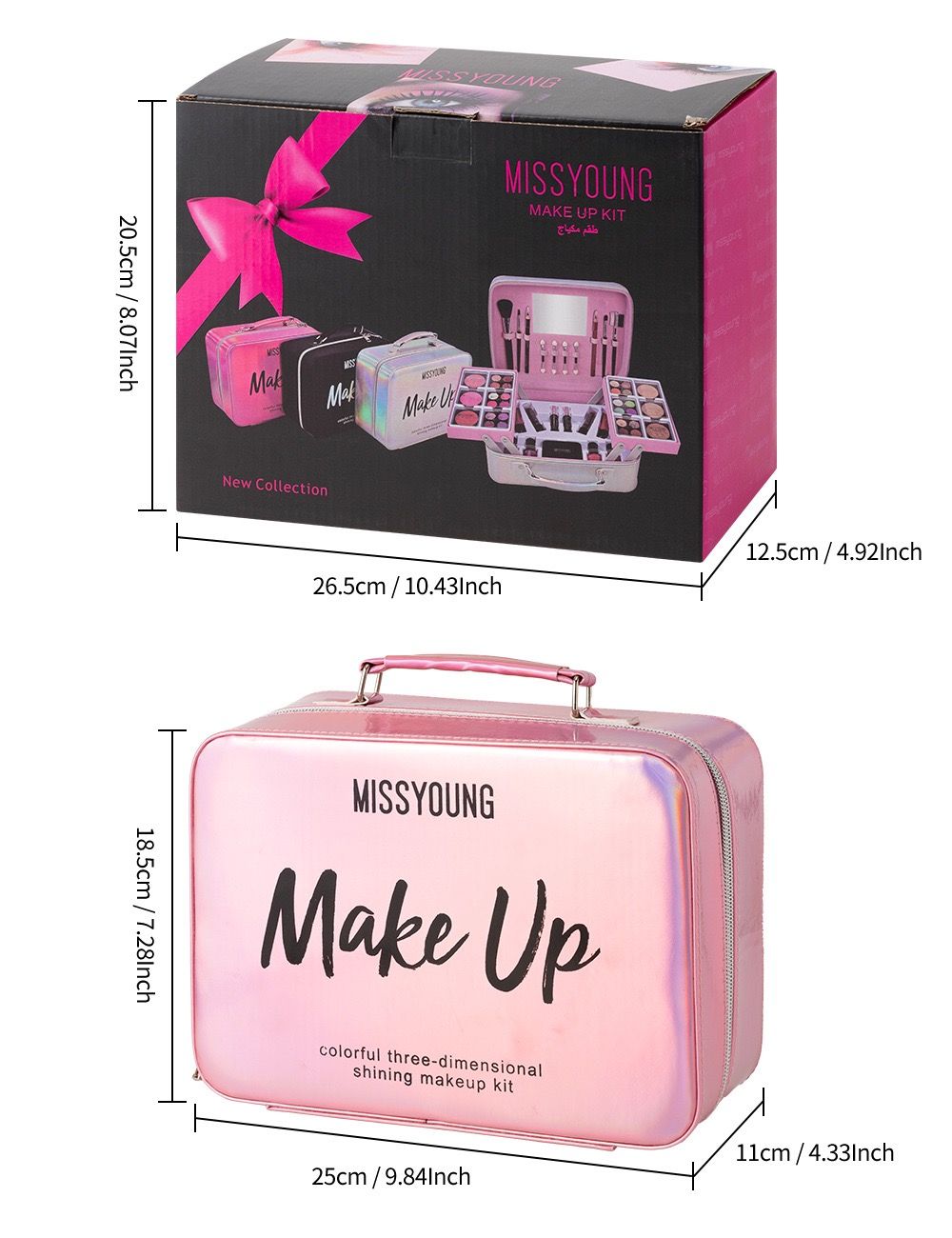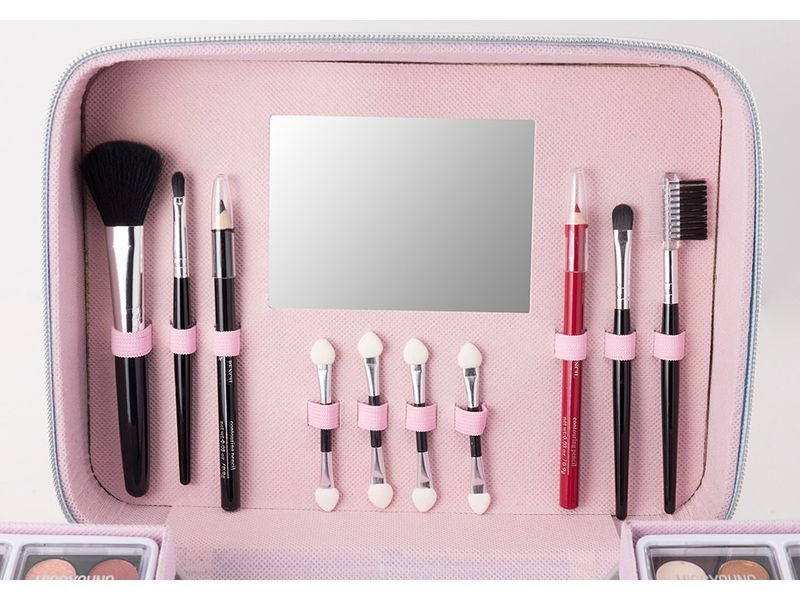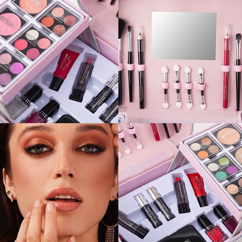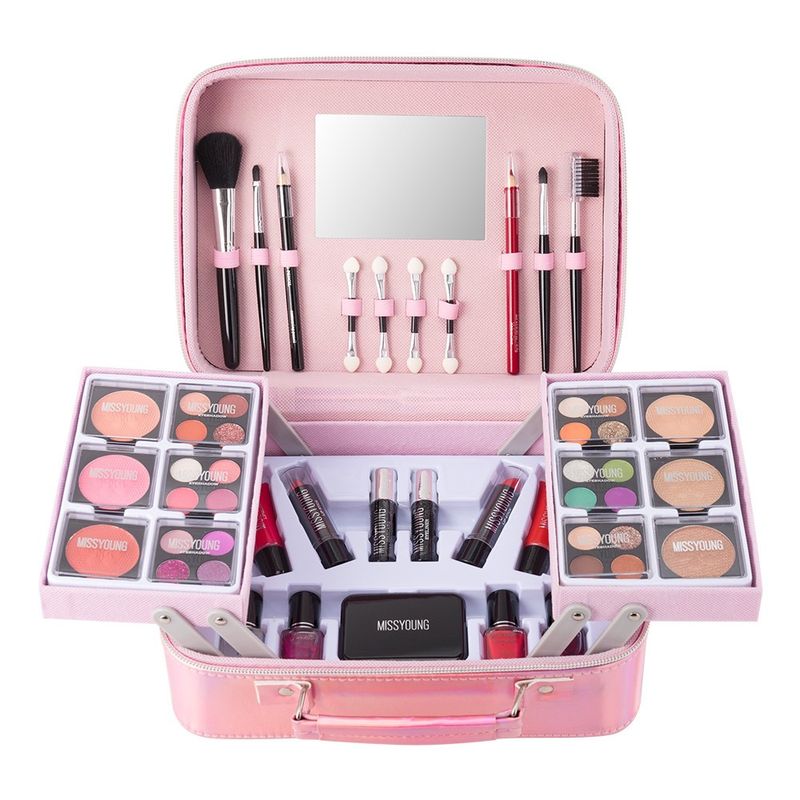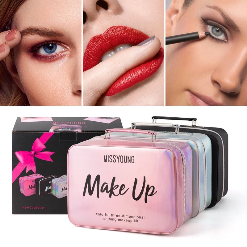 The MISSYOUNG makeup set features a dazzling laser-like finish, creating a stylish look. ✨ Open the box and you'll find everything you need: eyeshadow, blush, lipstick, nail polish, and more. It also includes a matching brush and a small mirror, perfect for every look, from daily commutes to dates and parties.